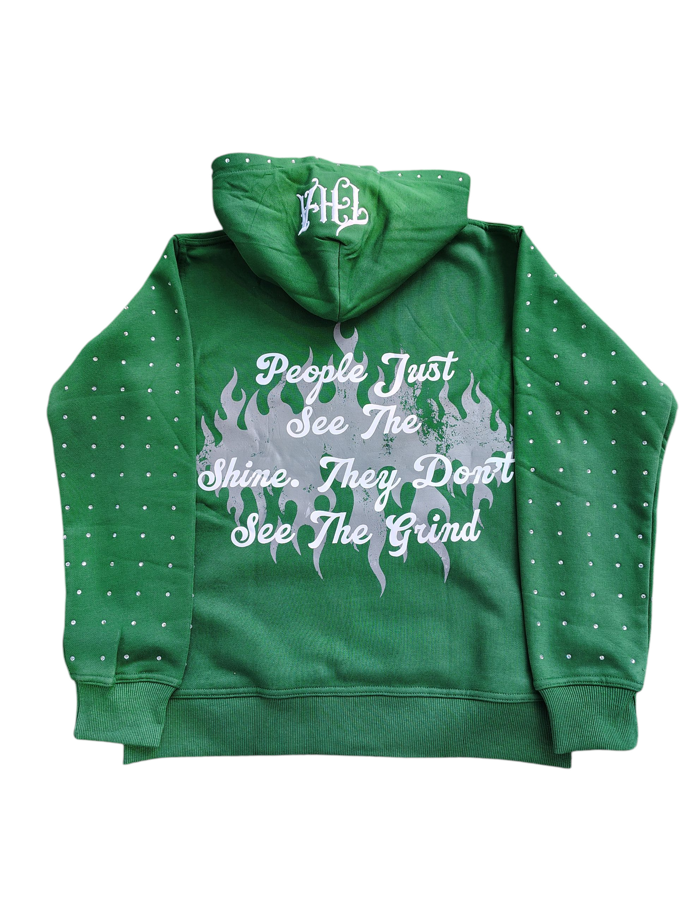 From casual coffee dates to weekend adventures, this hoodie adds that perfect pop of color and sparkle to your look. The rich green hue complements all skin tones while the rhinestone details ensure you'll never blend into the background.