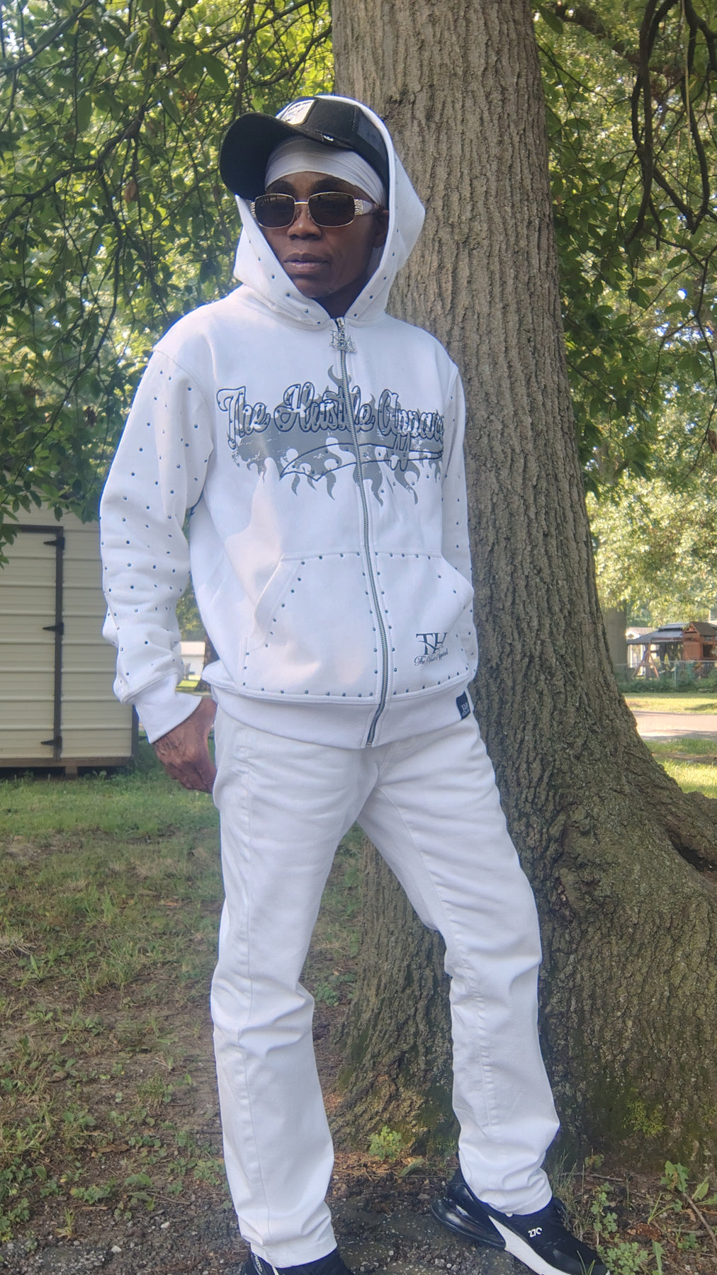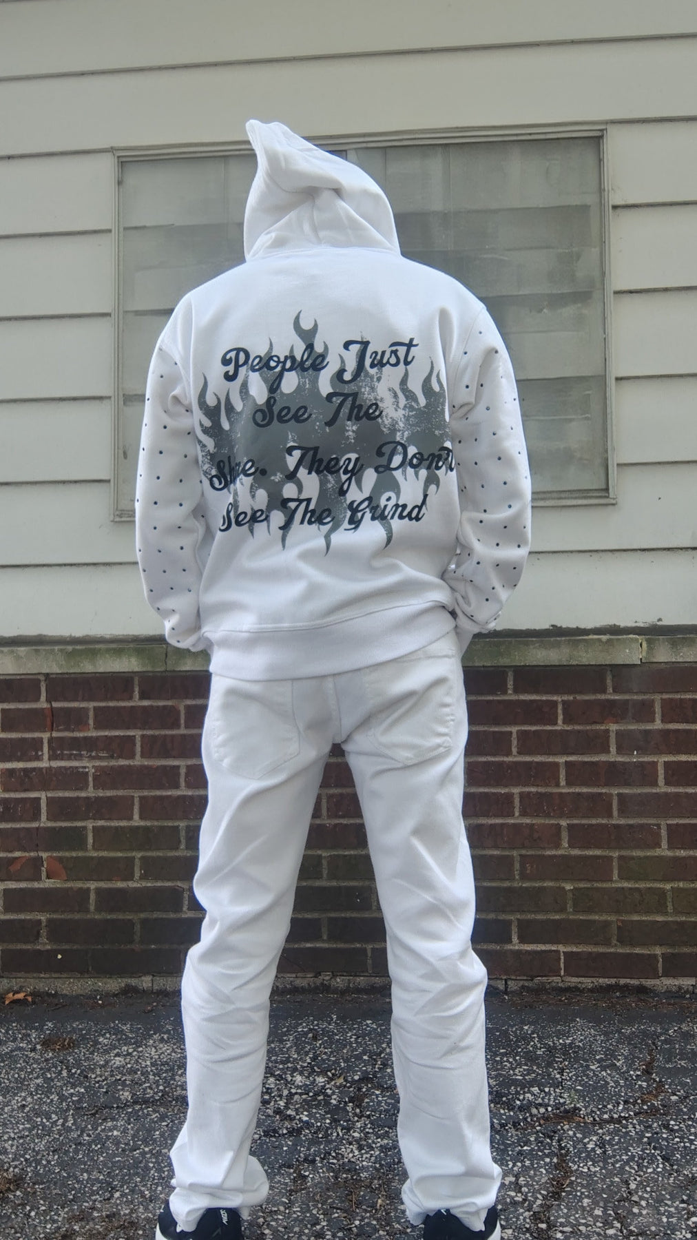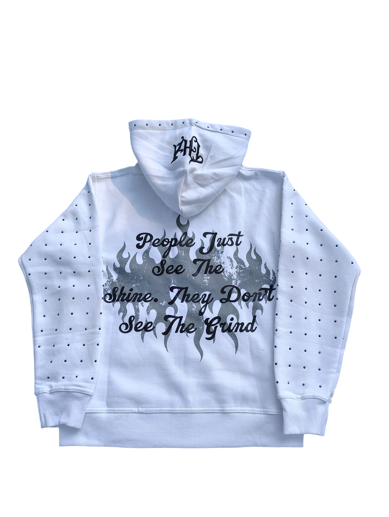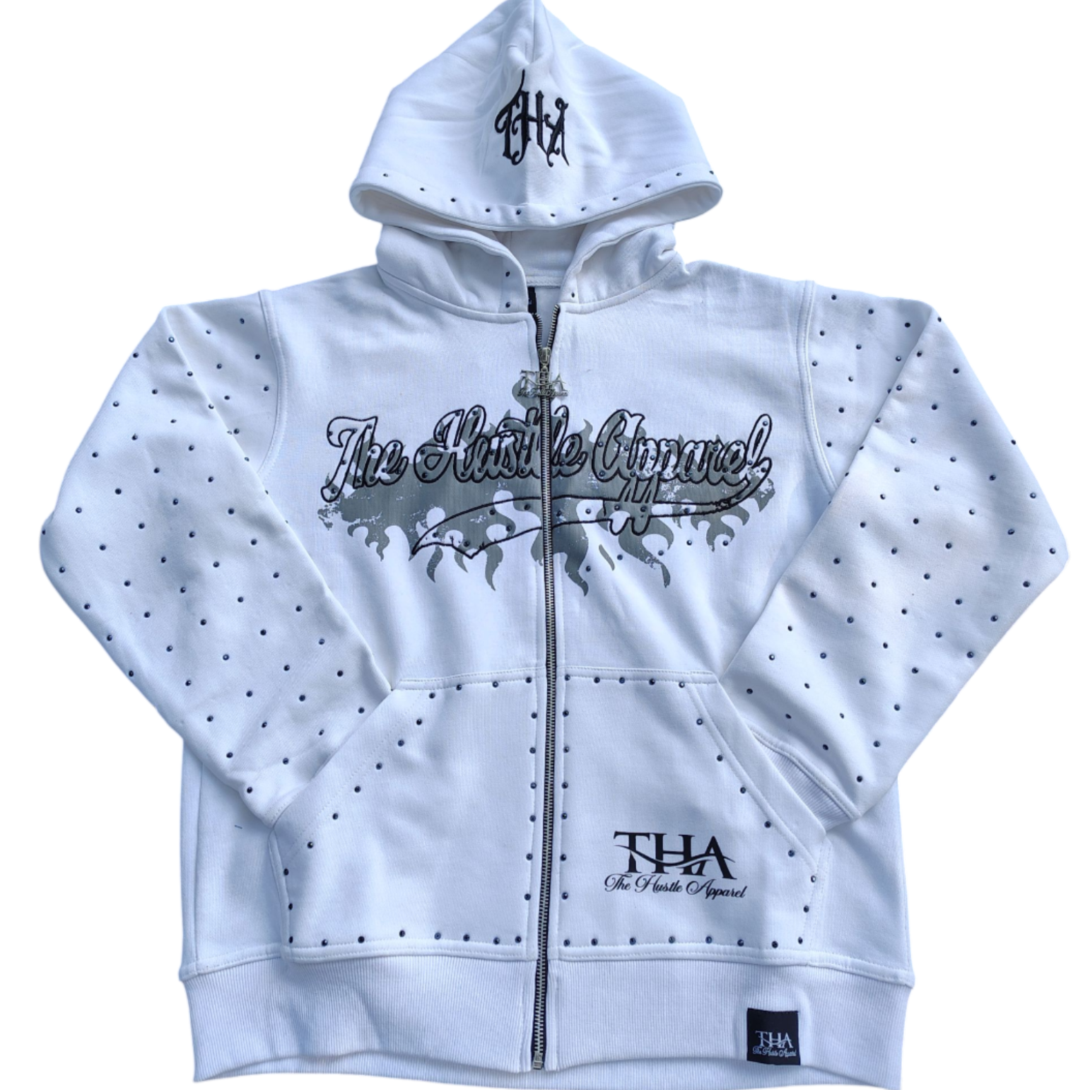 This white and black combination creates the perfect balance of elegance and edge. Whether you're heading to brunch, a casual meeting, or a night out, this hoodie delivers sophisticated style with a rebellious spirit. The contrast between the pure white fabric and bold black stones creates a visual impact that's impossible to ignore.